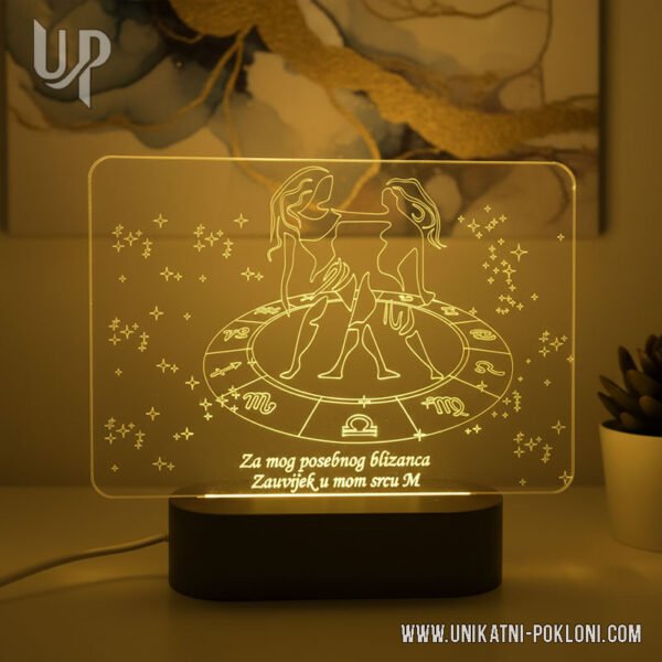 Dopustite svjetlu da obasja put vaših voljenih Blizanaca s ovom personaliziranom lampom koja će im donijeti radost i toplinu. Izrazite svoju ljubav na jedinstven i značajan način s ovim izvanrednim darom koji će ih pratiti kroz godine.