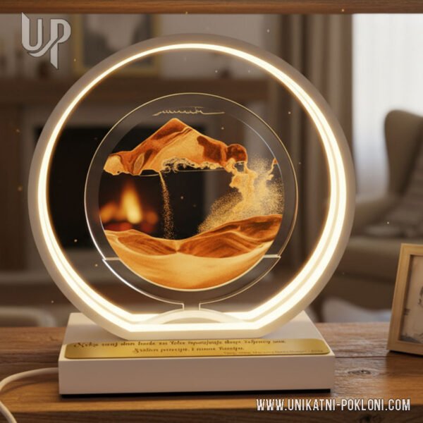Ova lampa poseban je poklon koji najčešće daruje kolektiv svojem dragom kolegi/ci prilikom odlaska u zasluženu mirovinu ili penziju. Osim što je dekorativan komad koji se savršeno uklapa u svaki ambijent ima i posebno značenje. Pijesak koji polagano curi predstavlja dane koji su prolazili sve ove godine. I ma koliko god svaki dan bio malen – pijesak na kraju ipak iscuri.
