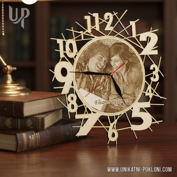 Ovaj personalizirani drveni sat idealan je poklon za rođendane, imendane, godišnjice i Božić – spaja eleganciju prirodnog drveta i vaš osobni pečat. Na ovaj neobični sat graviramo vašu fotografiju i tekst po želji, pa svaki komad postaje jedinstvena uspomena.